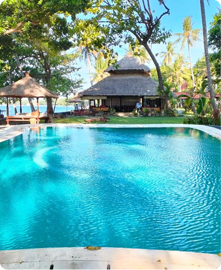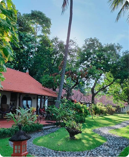 The venue for this BBTRS® Training is set in the beautiful Balinese countryside, facing the sea. It’s a stunning spot for snorkeling and with a bit of luck, you might even see some dolphins. During the training, there will also be opportunities to just relax and enjoy the pool or to treat yourself at their Wellness Centre which offers Balinese, Ayurvedic, and Western-inspired beauty and health treatments. Accommodation is in Balinese-style bungalows constructed out of bamboo, natural stone, and wood, equipped with open-air bathrooms, hot water, fully-equipped kitchens, and bedrooms with mosquito nets. We will enjoy three buffet meals a day with a large variety of healthy Indonesian and Western-inspired foods, largely vegetarian and some fresh fish dishes, served at the beach-facing restaurant. Mineral water, different teas, Balinese coffee, and cocoa are available throughout the day.